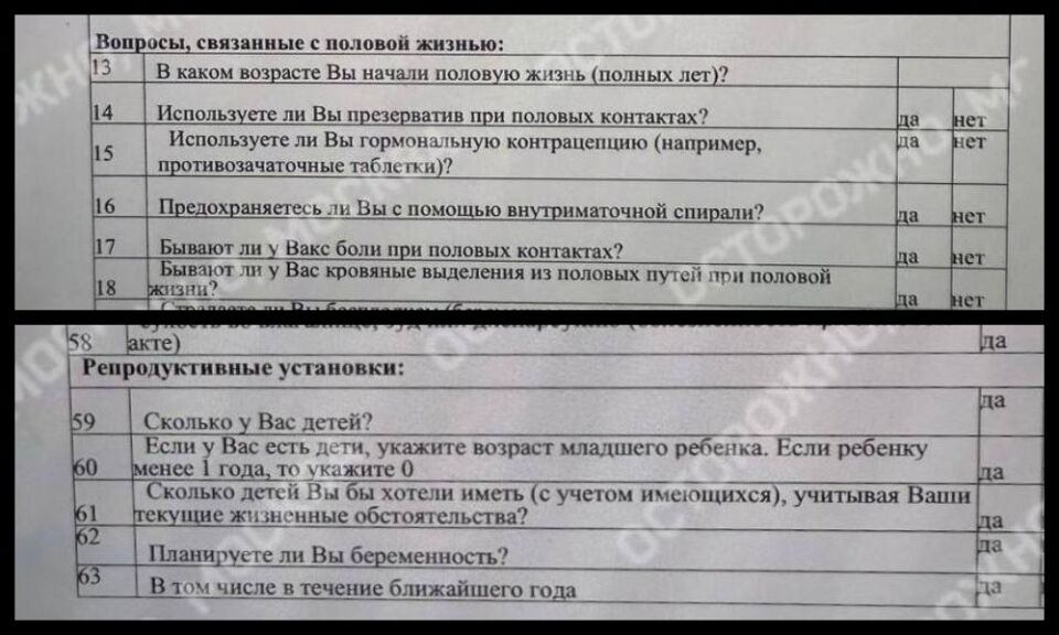 В Подмосковье бюджетниц также опросили о репродуктивном здоровье, сообщает «Осторожно, Москва». Анкеты им разослали в октябре, сведения собирались передать в отдел кадров. Вопросы вызвали у женщин возмущение, часть работниц не стали на них отвечать, однако тем, кто поставил прочерки «надо будет встретится с врачами лично и ответить на эти же вопросы добровольно-принудительно», рассказали сотрудницы изданию.